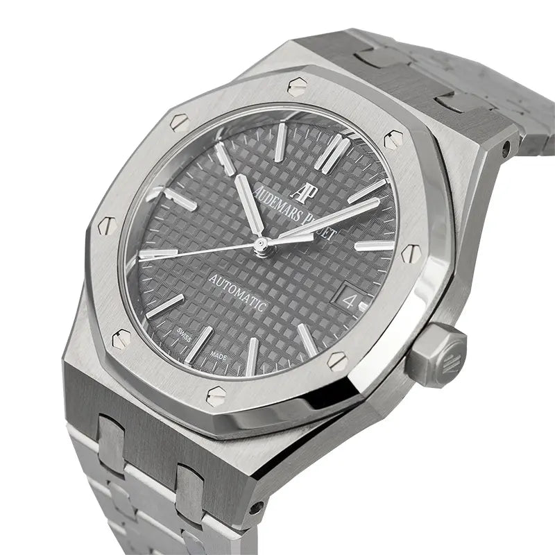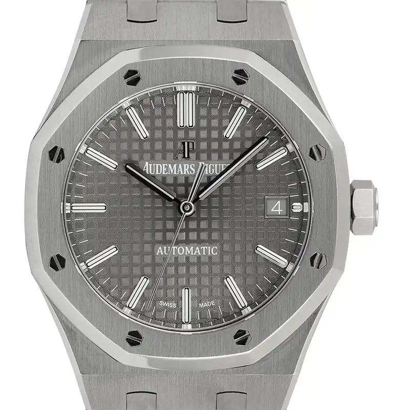 ساعة أوديمار بيجيه رويال أوك ٣٧ مم، رقم المرجع ١٥٤٥٠ST.OO.١٢٥٦ST.٠٢، مصنوعة من الفولاذ المقاوم للصدأ، بميناء بلون الروثينيوم بنقش "جراند تابيسري". تتميز هذه الساعة بعلبة من الفولاذ المقاوم للصدأ، وغطاء خلفي من كريستال الياقوت المقاوم للتوهج. ميناء بلون الروثينيوم بنقش "جراند تابيسري"، وعلامات ساعات مطلية بالذهب الأبيض، وعقارب رويال أوك مطلية بطبقة مضيئة. سوار من الفولاذ المقاوم للصدأ مع مشبك قابل للطي من AP. تعمل بحركة معصمك الطبيعية.