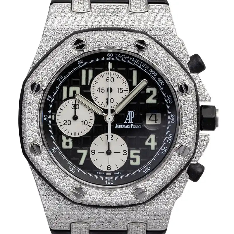 ساعة أوديمار بيغيه رويال أوك أوفشور المصنوعة من الفولاذ المقاوم للصدأ، رقم المرجع 25940SK.OO.D002CA.03، مصممة خصيصاً لترصيع علبة وإطار الساعة بألماس VS1 باستخدام تقنية "قرص العسل". تتميز هذه الساعة بميناء أسود بأرقام عربية بيضاء، وسوار مطاطي أسود مع مشبك قابل للطي من الفولاذ المقاوم للصدأ، وزجاج من الياقوت، وغطاء خلفي صلب، وتعمل بحركة أوتوماتيكية ذاتية التعبئة مع كرونوغراف وخاصية التاريخ.