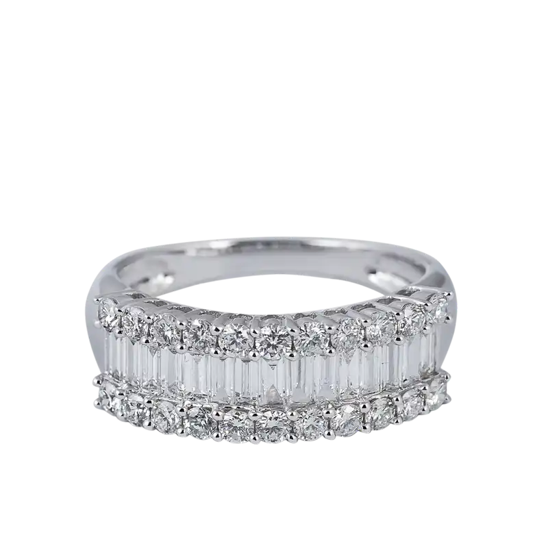 خاتم "تايم فور دايموندز" من تصميمنا الخاص، مصنوع من الذهب الأبيض عيار 18 قيراطًا، مرصع بماسات مستديرة لامعة من نوع VS1 وأحجار باغيت. الوزن الإجمالي للقيراط من الماس 1.18 قيراط.