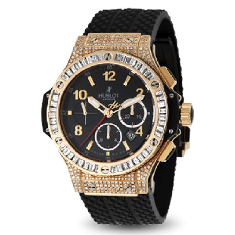 ساعة بيغ بانغ كرونوغراف سوداء اللون، بقطر علبتها 41 مم، تتميز بإطار مرصع بالألماس على شكل باغيت وعلبتها المرصعة بالألماس. كما تتوفر بقطر علبتها 44 مم.