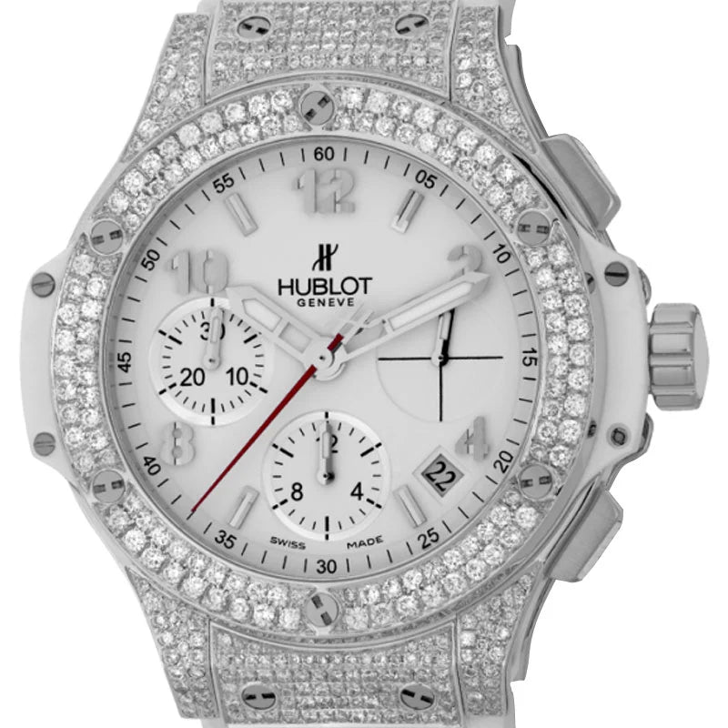 ساعة بيغ بانغ كرونوغراف بقطر علبتها 44 مم، باللون الأبيض، وهيكلها من الفولاذ المقاوم للصدأ، وإطارها وعلبتها مرصعان بالألماس. تتوفر هذه الساعة أيضًا بقطر علبتها 41 مم.