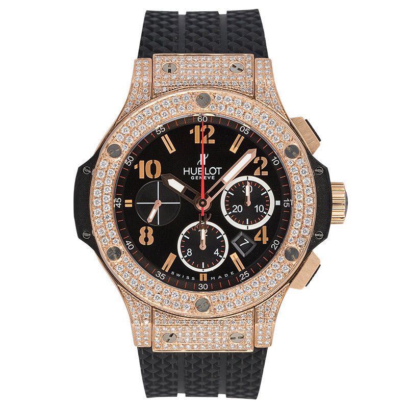 تتميز ساعة Hublot Big Bang Chronograph 44mm المصنوعة من الذهب الوردي بإطار وعلبة مخصصة مرصعة بالماس، وقرص أسود بأرقام عربية ذهبية وحزام مطاطي.