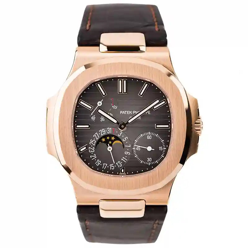 تتميز ساعة Patek Philippe Nautilus 5712R-001 هذه بحركة ميكانيكية ذاتية التعبئة، عيار 240 PS IRM C LU، مراحل القمر، التاريخ يدوياً ومؤشر احتياطي الطاقة، ميناء فرعي للثواني، ميناء أسود بني، علامات الساعات المطلية بالذهب مع طلاء مضيء، تاج لولبي، مشبك قابل للطي، غطاء خلفي من الكريستال الياقوتي، مقاومة للماء حتى 60 متر، ذهب وردي، قطر العلبة (الساعة 10-4): 40 مم.