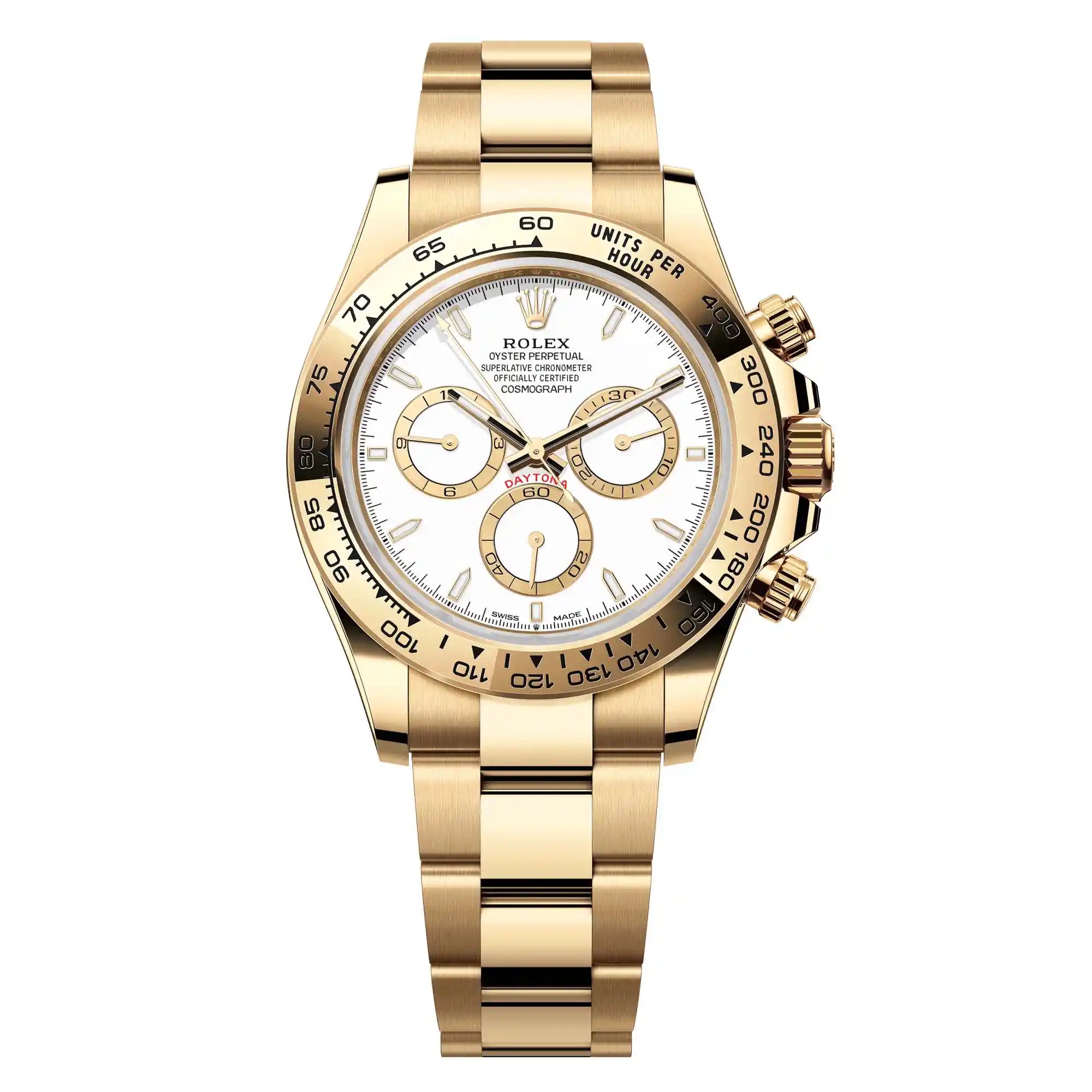 ساعة أويستر بربتشوال كوزموغراف دايتونا، مصنوعة من الذهب الأصفر عيار ١٨ قيراطًا، بميناء أبيض وحلقات عداد متباينة اللون. تتميز بسوار أويستر وإطار من الذهب الأصفر عيار ١٨ قيراطًا بمقياس تاكيمتري محفور.