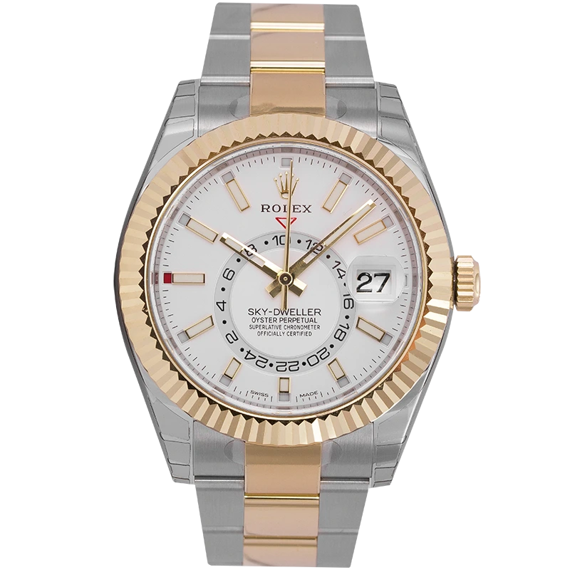 ساعة رولكس سكاي-دويلر الرائعة، المصنوعة من الفولاذ والذهب الأصفر، رقم 326933، بعلبة أويستر، قطرها 42 مم، مصنوعة من الفولاذ والذهب الأصفر، وميناء أبيض، وإطار رولكس رينغ كوماند دوار ثنائي الاتجاه، ونظام توينلوك لمقاومة الماء، وياقوت مقاوم للخدش، وعدسة سايكلوبس فوق كريستالة التاريخ، ومقاومة للماء حتى عمق 100 متر. تتميز بحركة بربتشوال ميكانيكية ذاتية التعبئة، ذات منطقتين زمنيتين، وتقويم سنوي. السوار: أويستر، وصلات مسطحة من ثلاث قطع، روليسور أصفر - مزيج من الفولاذ 904L والذهب الأصفر عيار 18 قيراطًا.