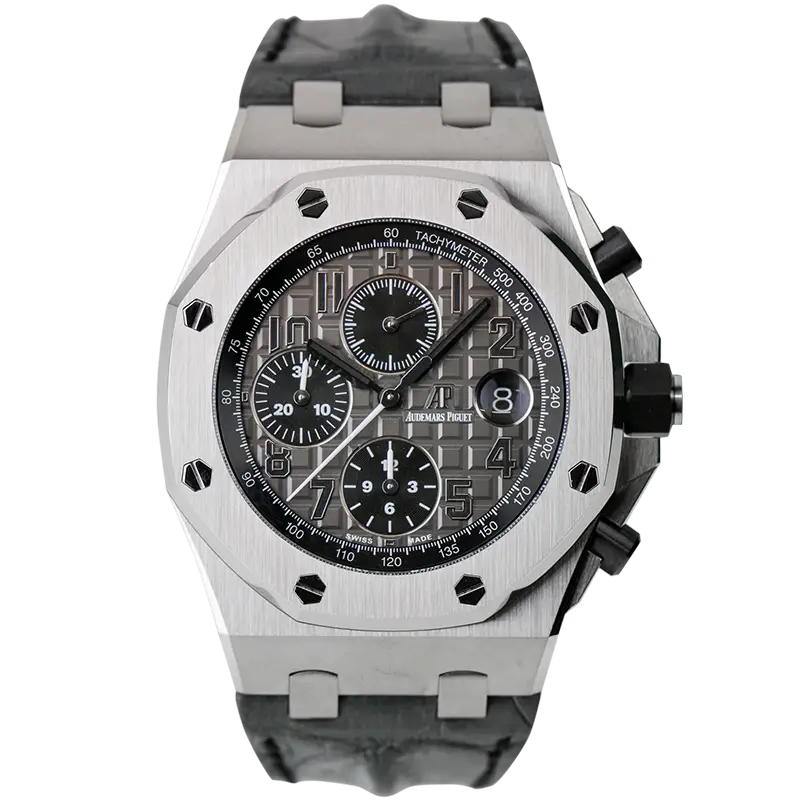 كرونوغراف رويال أوك أوفشور من أوديمار بيغيه. تتميز بعلبة فولاذية بقطر 42 مم، وميناء رمادي أردوازي، وسوار من جلد التمساح الرمادي "هورنباك" مخيط يدويًا، مع سوار من الفولاذ المقاوم للصدأ بإبزيم دبوسي. تعمل هذه الساعة بحركة أوتوماتيكية.