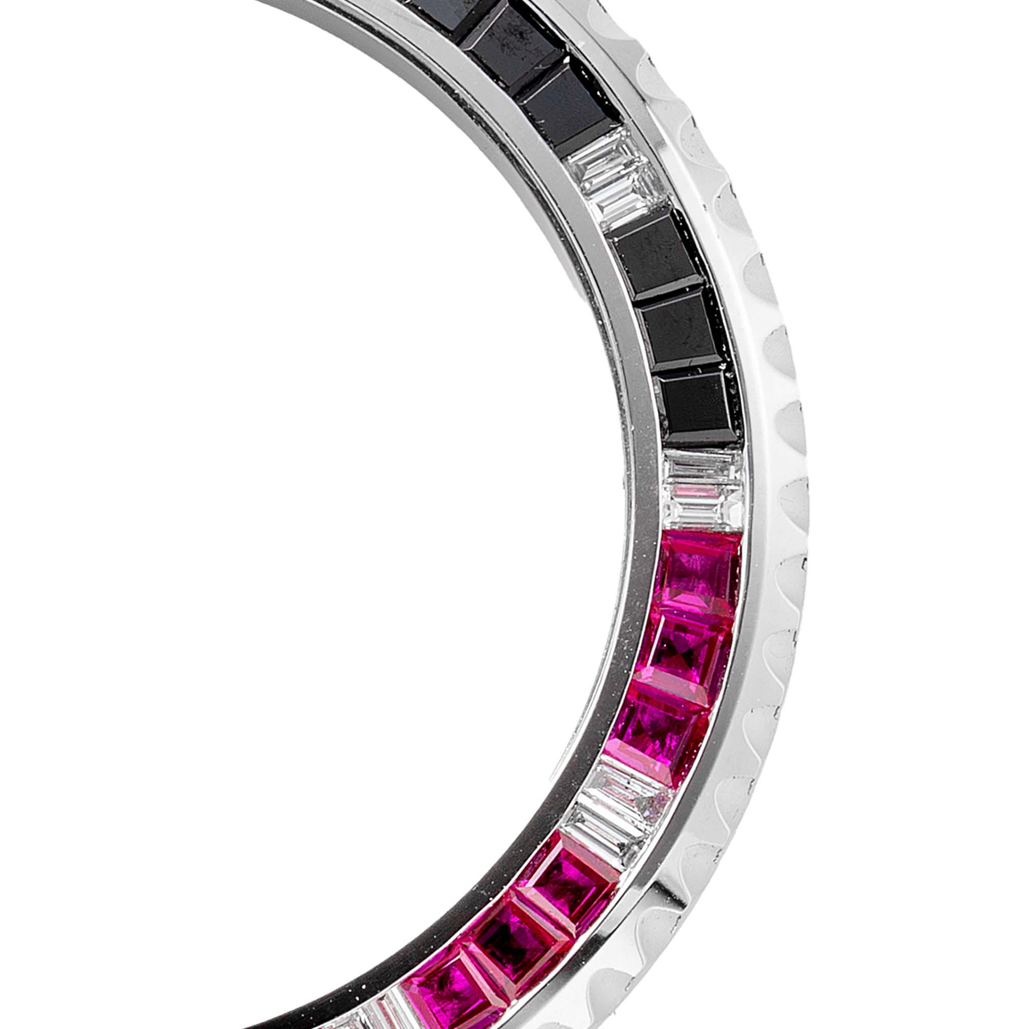 This is a custom white gold bezel set with black/red stones and diamonds. This bezel fits the Rolex GMT-Master II watch.